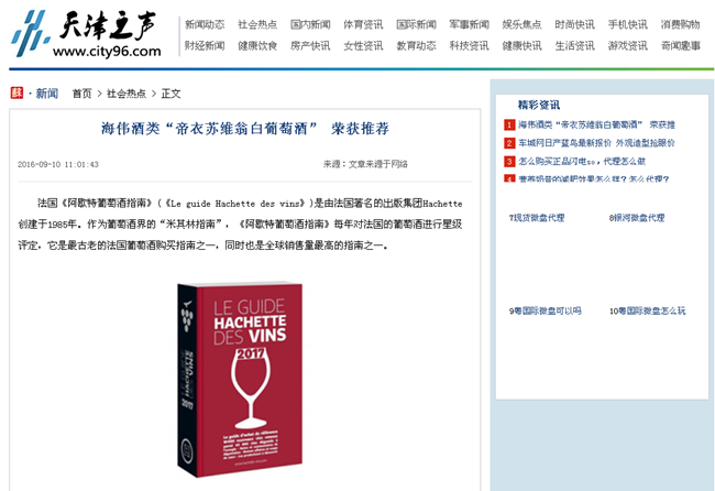 海伟酒类“帝衣·苏维翁白葡萄酒” 荣获2017全球葡萄酒买家必读法国葡萄酒专业指南 《Le Guide Hachette Des Vins》(2017)推荐